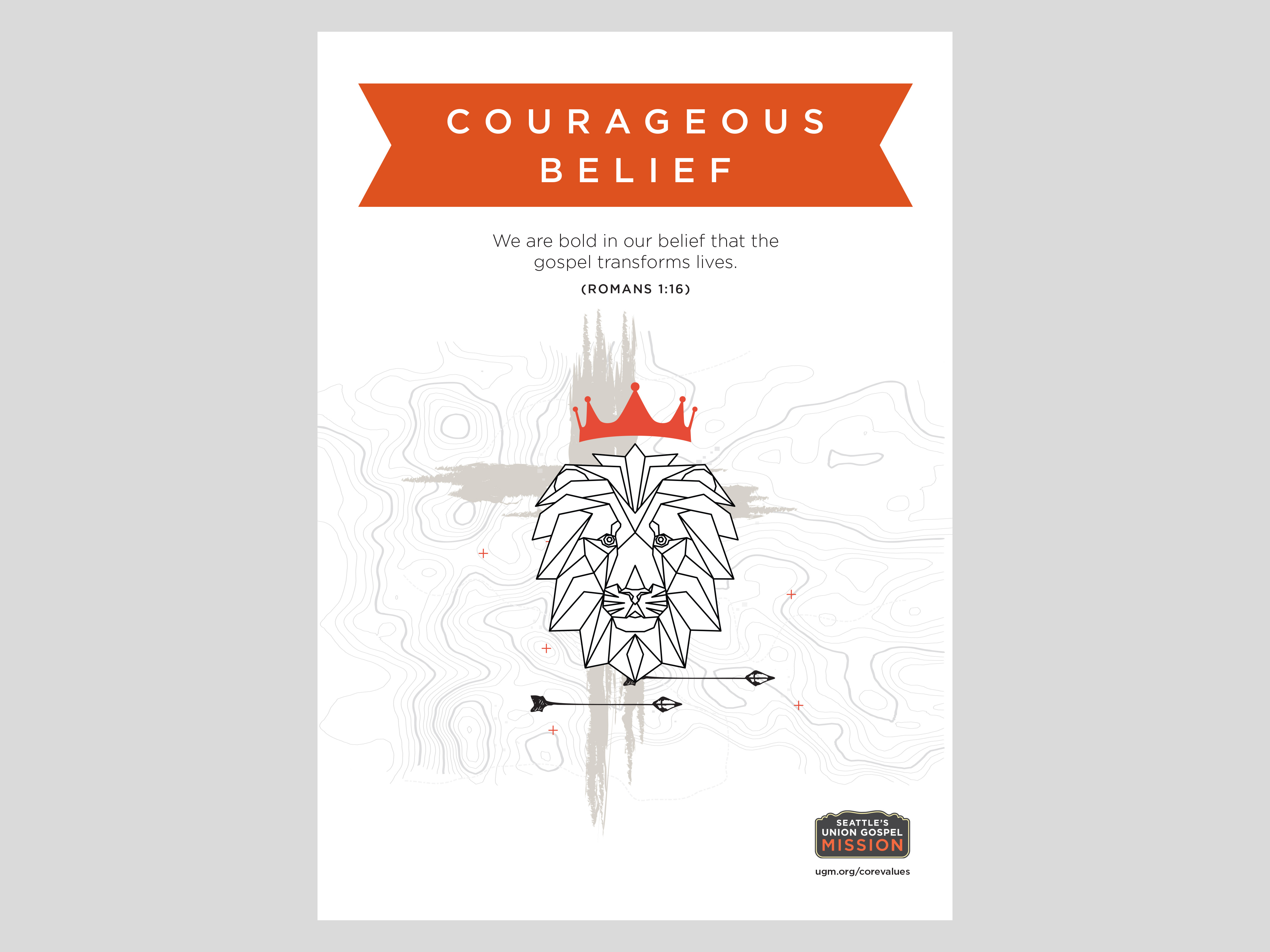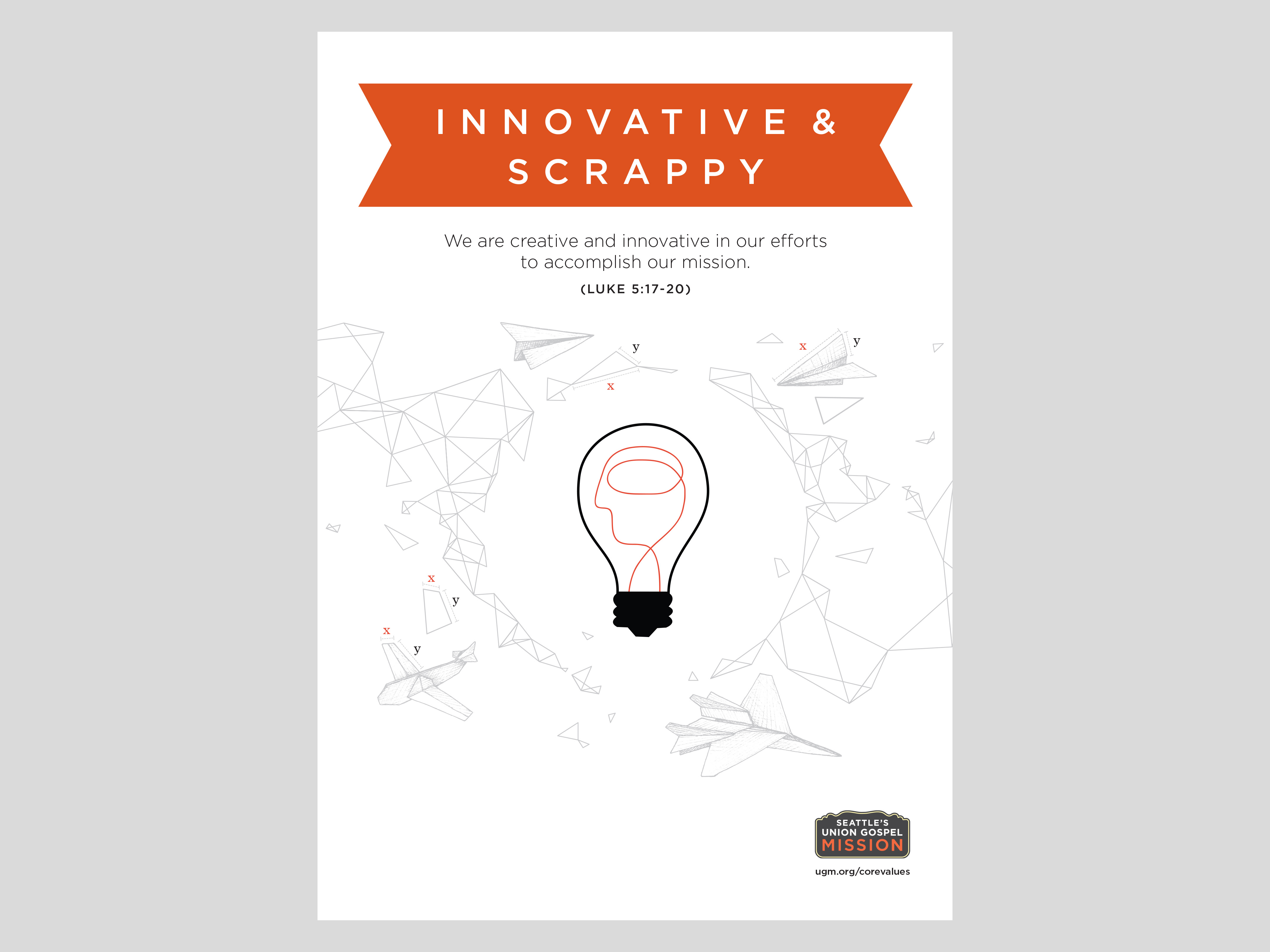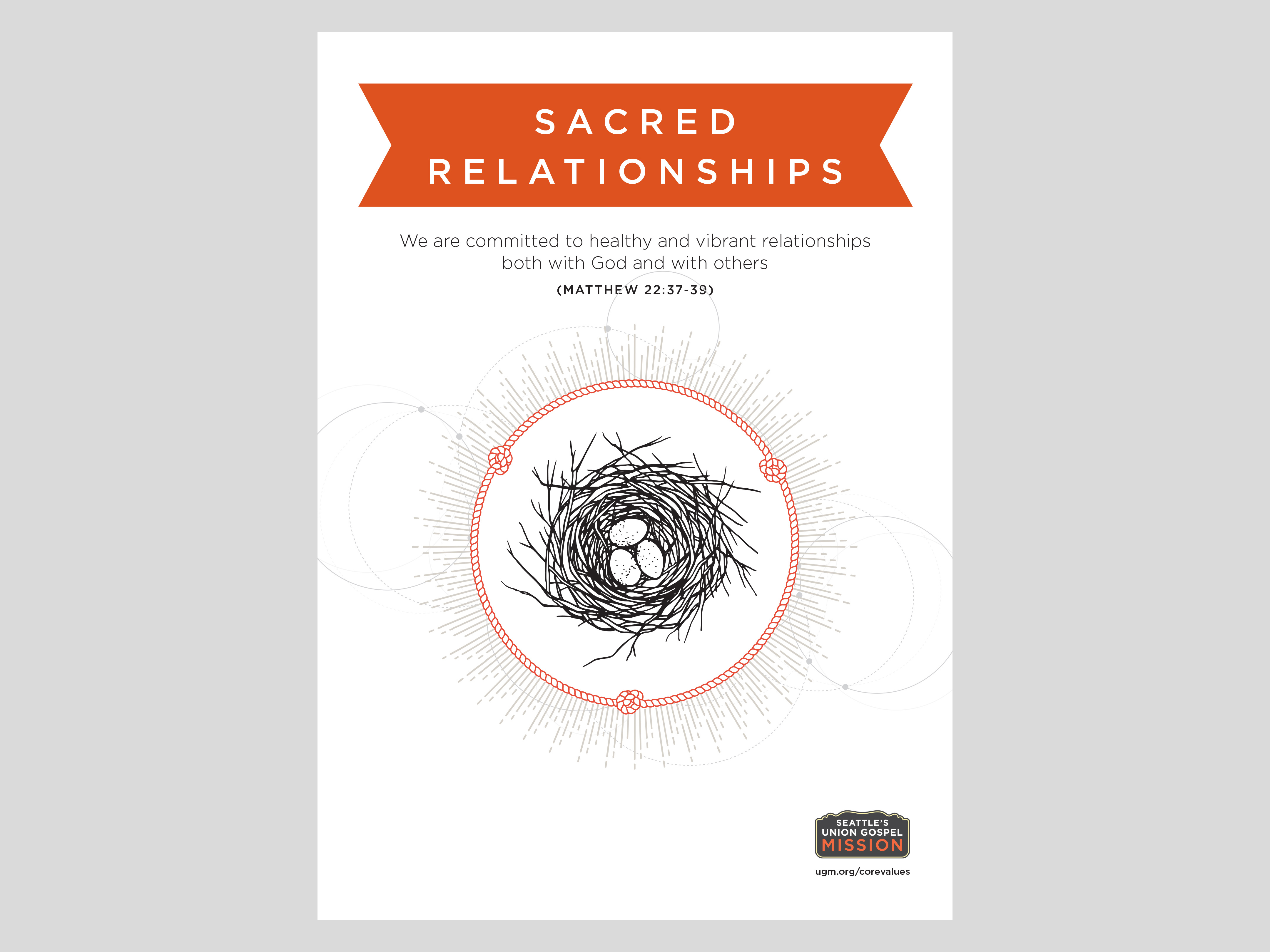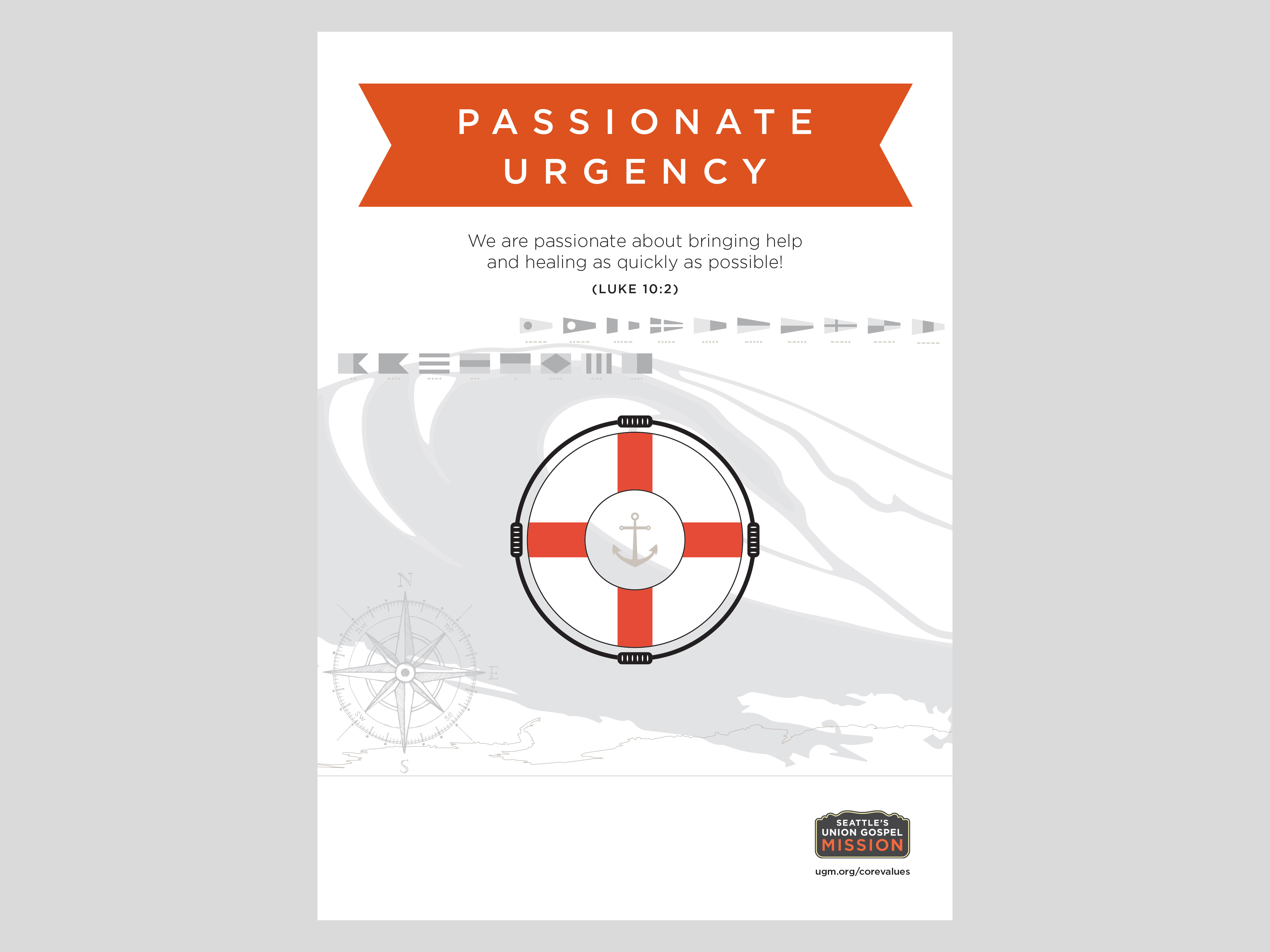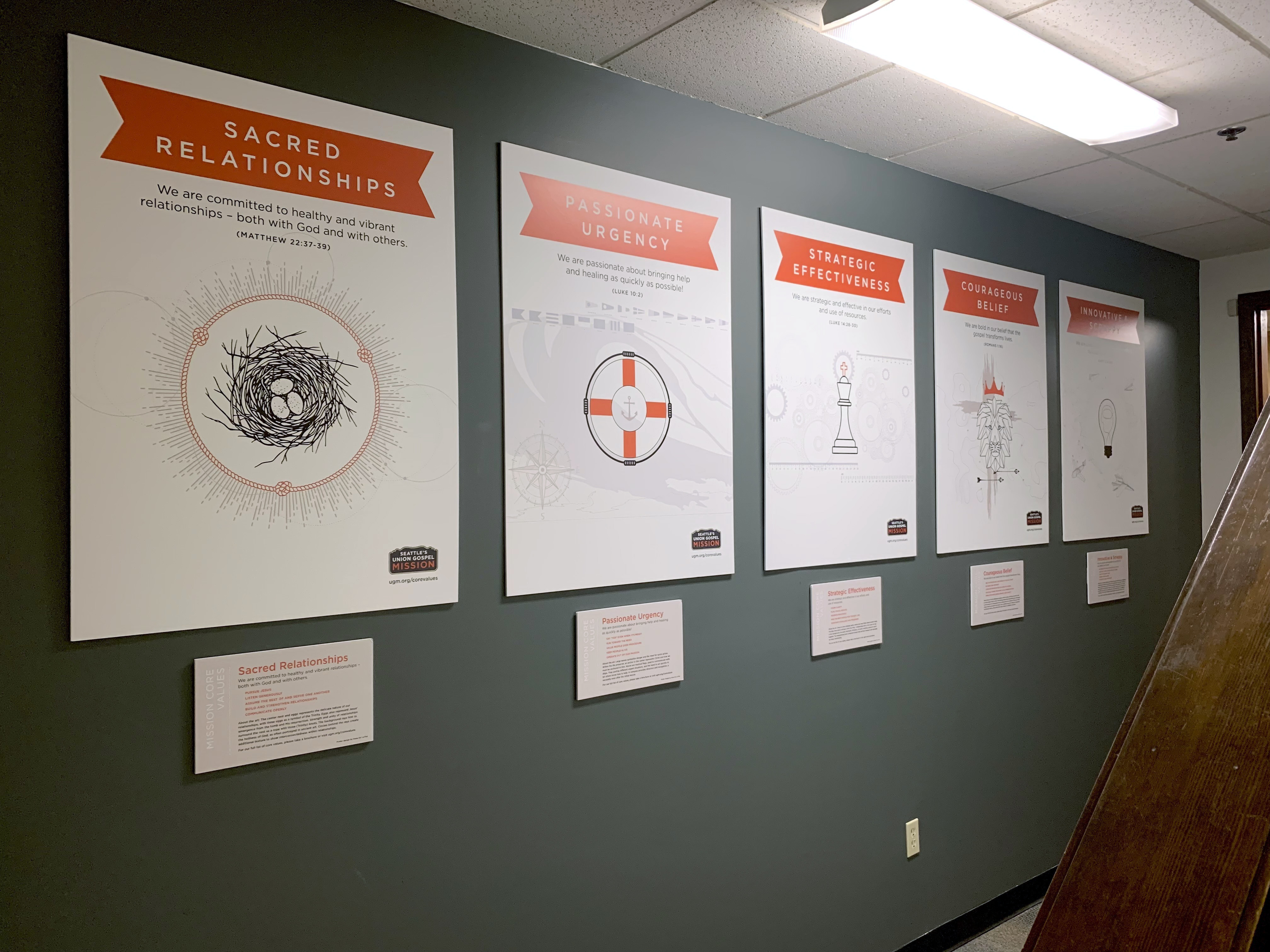Illustrative poster series for Seattle’s Union Gospel Mission incorporating the five core values of the organization.