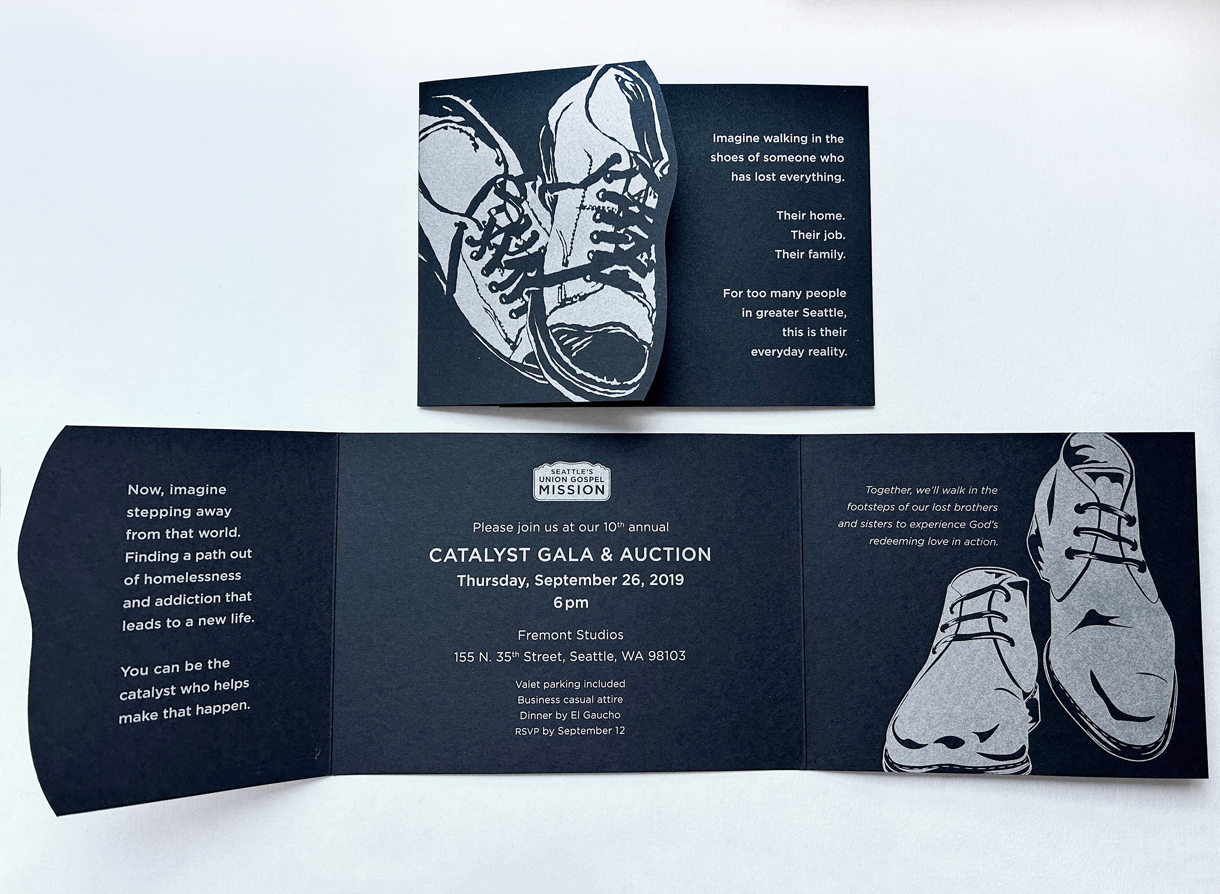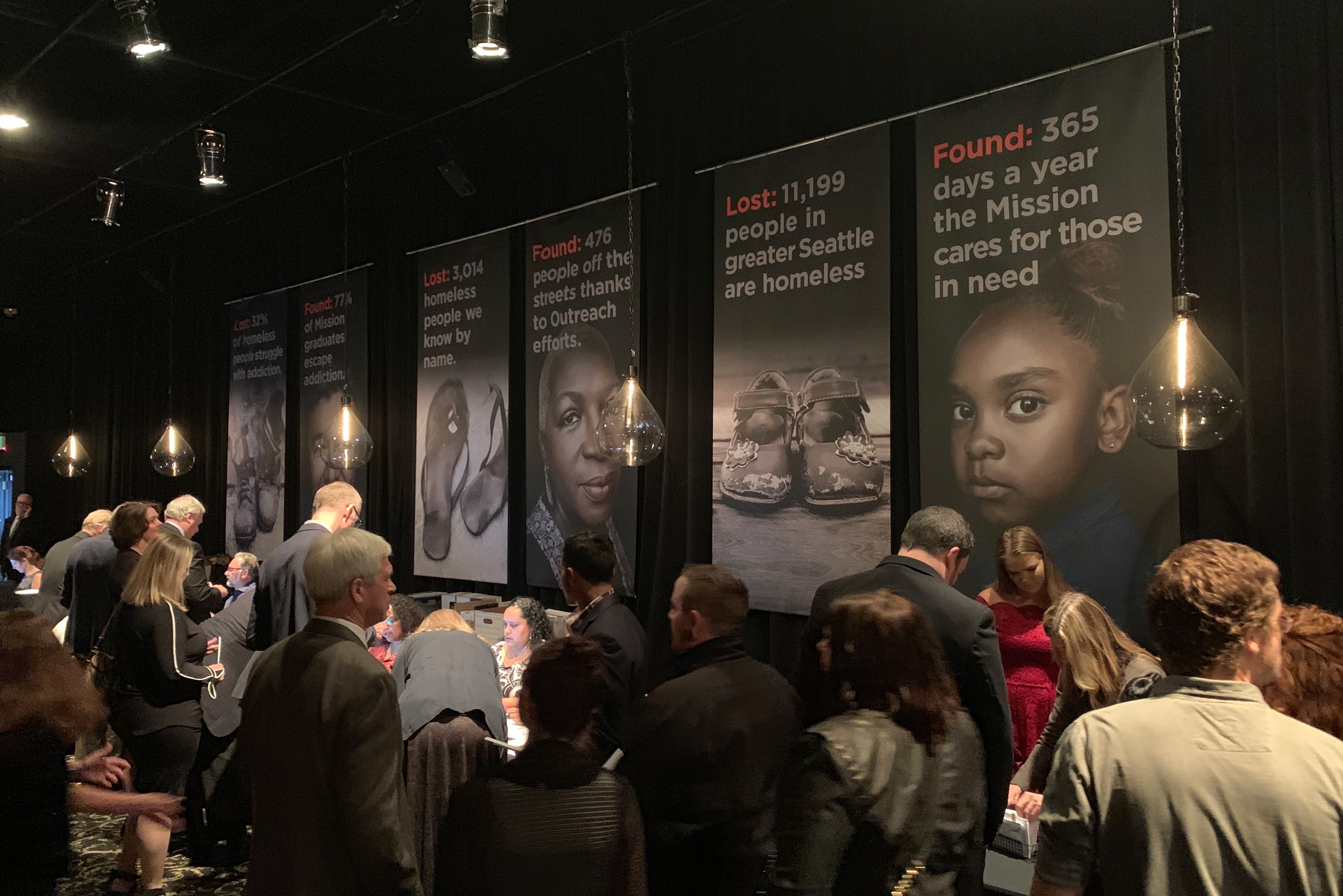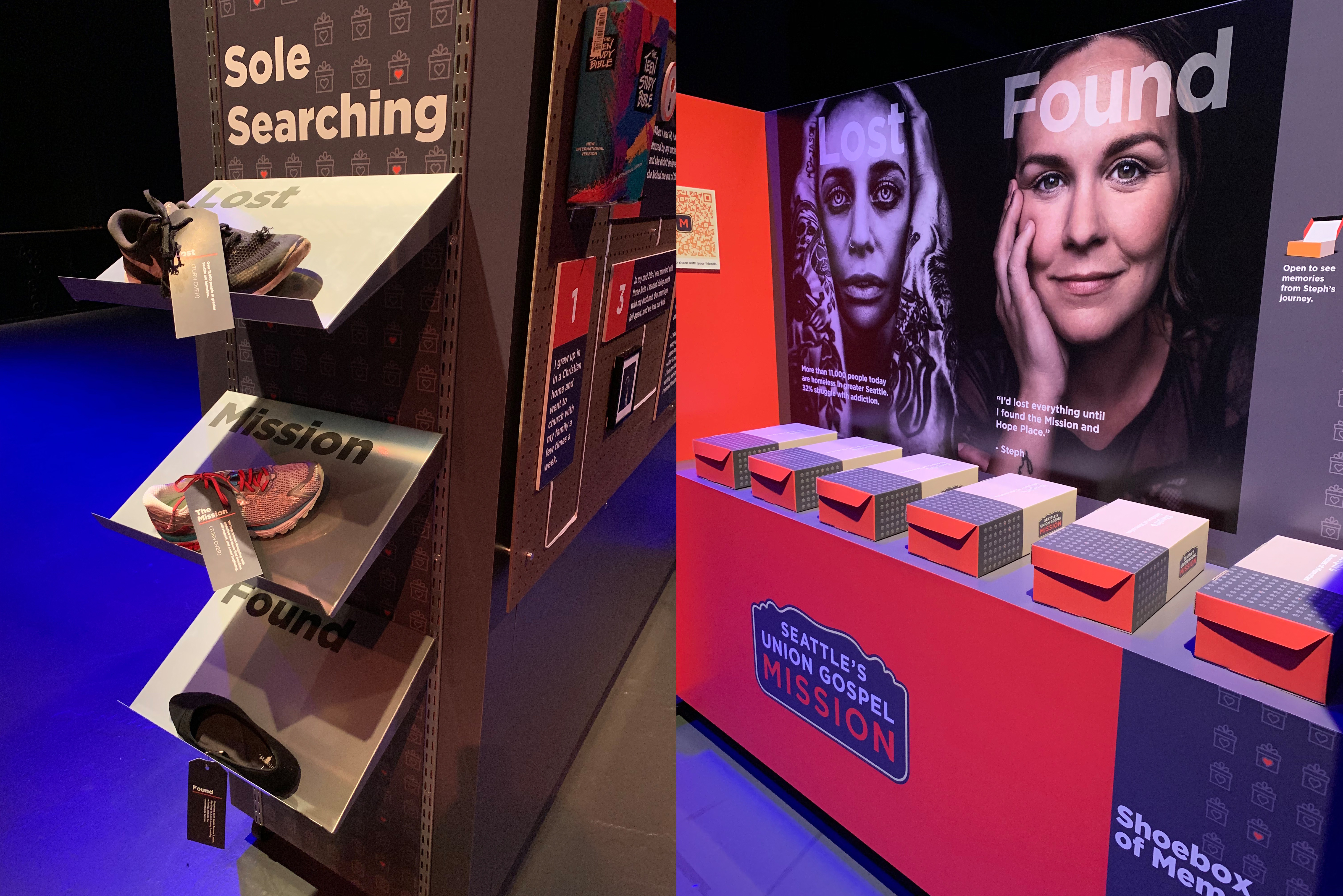Each year, Seattle’s Union Gospel Mission hosts a gala to engage donors and raise awareness about homelessness, with an expected fundraising goal of $1.5–2 million. This above theme invited donors to hear powerful stories of recovery and interact with kiosks that allowed them to figuratively step into the shoes of those experiencing homelessness. The event was anchored in the organization’s Lost and Found brand messaging.