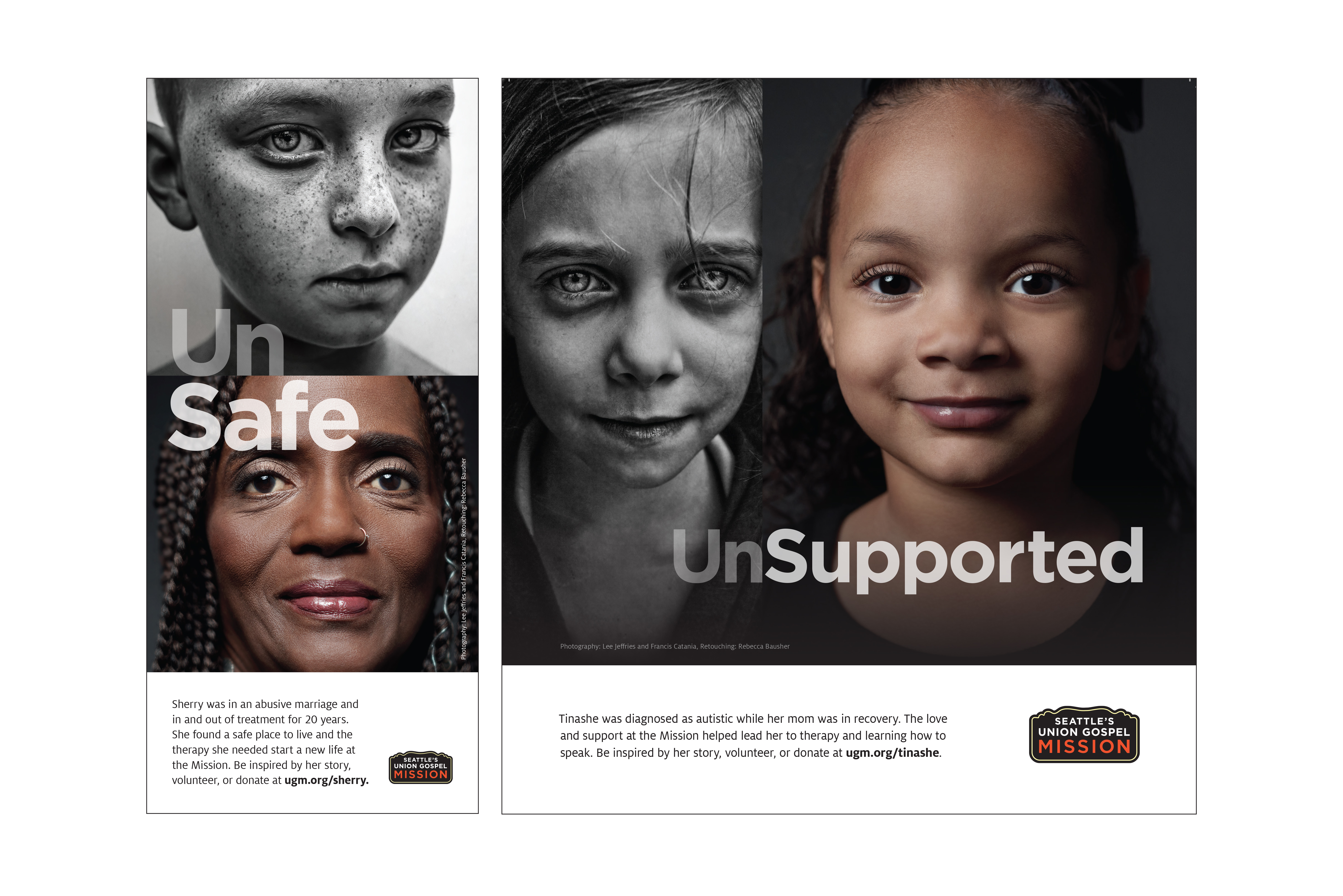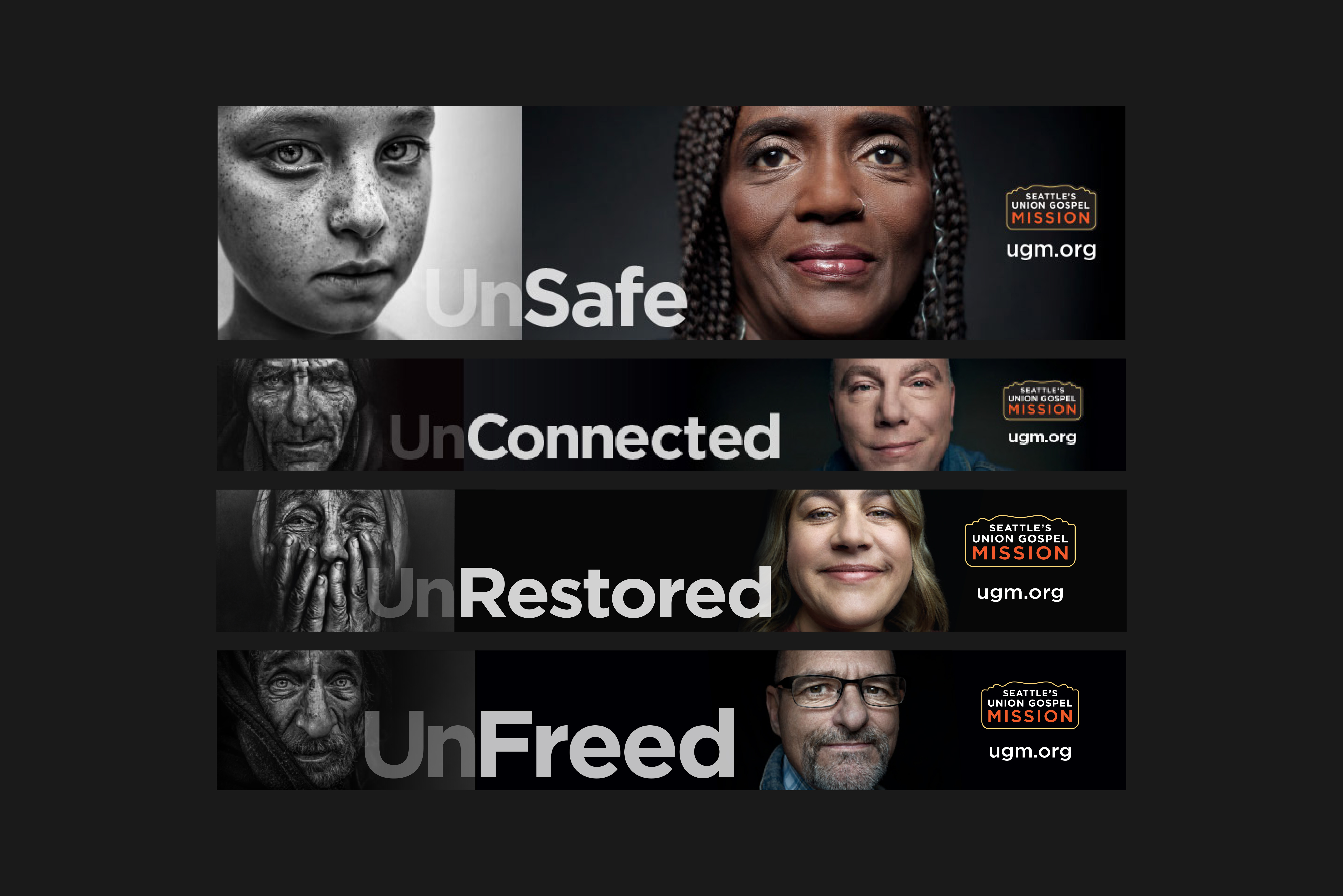 In 2018, the Lost + Found campaign was launched, inspiring several variations in the years that followed. The most recent, the Un Campaign, was developed in collaboration with our Creative Director. By juxtaposing the prefix “Un” with a transformed positive word, the campaign highlighted the success of individuals who had received recovery services. Art direction included overseeing both black-and-white street photography and color studio photography, as well as guiding design across all media and channels.